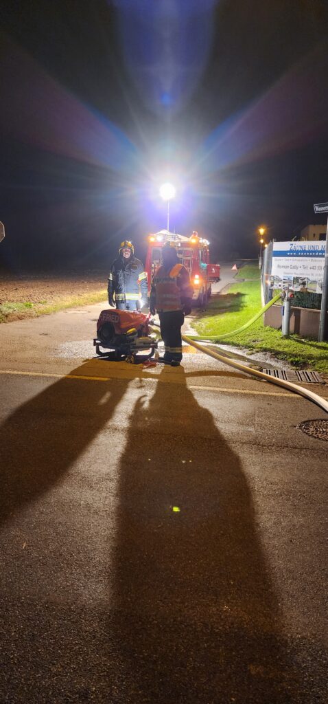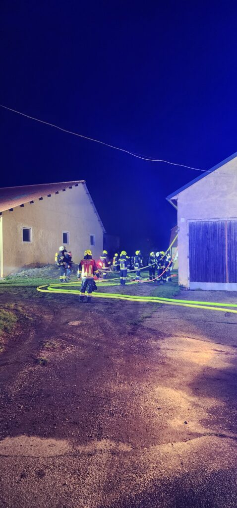 Unsere Feuerwehr stellte einen Atemschutztrupp, der umgehend mit der Personensuche im Innenangriff begann. Parallel dazu wurde gemeinsam mit der FF Elsbach eine Zubringleitung vom nächstgelegenen Hydranten gelegt, um die Löschwasserversorgung sicherzustellen.